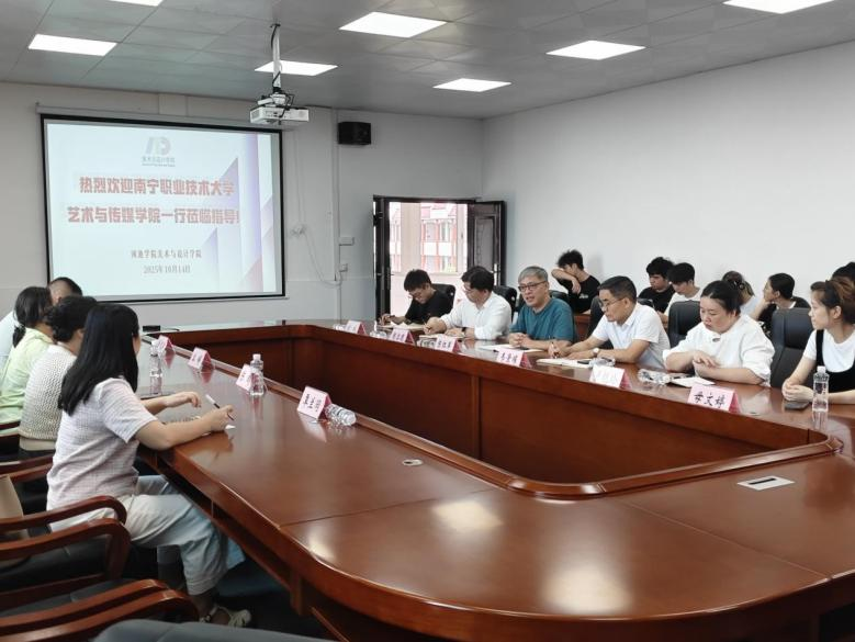 10月14日,南宁职业技术大学艺术与传媒学院副院长陈鹏及相关专业教师到我院开展交流活动。我院院长陈红军、副院长韦景耀、产品与服装设计系副主任卢艳玲及相关专业师生代表参加了此次交流活动。双方围绕专业建设、人才培养模式、产教融合途径、职业技能赛事、乡村振兴主题的产学研项目、民族技艺人才培训与技能认证、教师学术能力提升等议题进行了深入探讨和交流。