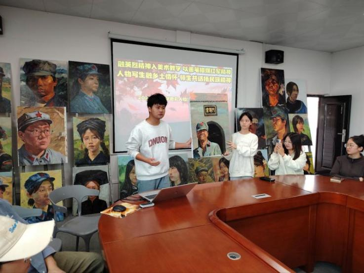 在作品展示与交流环节,现场集中呈现了近30幅由学生创作的革命英雄色彩头像作品。作品题材丰富,涵盖红军指挥员、普通战士、医护人员等不同角色,均以学生家乡的革命英雄为原型,巧妙融入地方文化元素与红色精神内涵。多位学生代表结合自身创作体验,分享了在艺术实践中对英雄事迹与家国情怀的感悟,现场形成师生共话、精神传承的浓厚氛围。