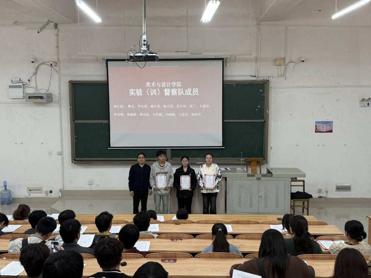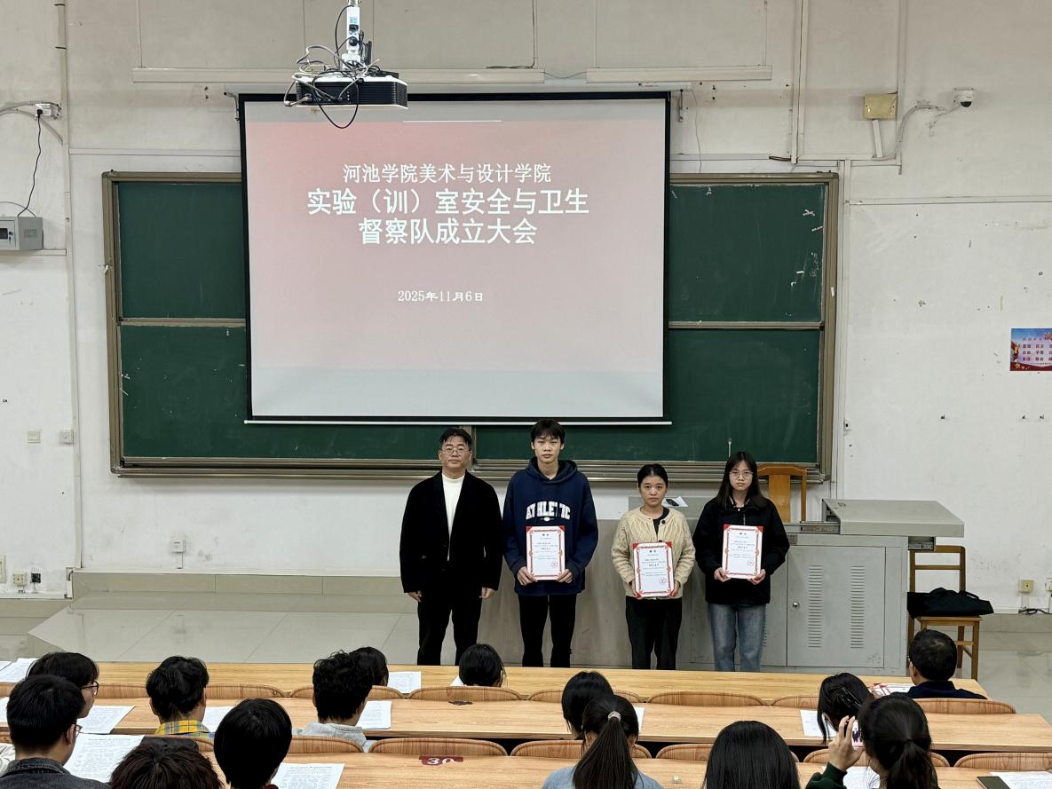 为进一步加强美术实训室的规范化管理,营造安全、整洁、有序的教学与实践环境,提升广大师生的安全卫生意识,2025年11月6日,美术与设计学院在弘毅楼1-1-102举行实训(验)室卫生与安全督察队成立大会。学院相关领导老师,各班级班长、生活委员及督察队首批成员参加活动。
