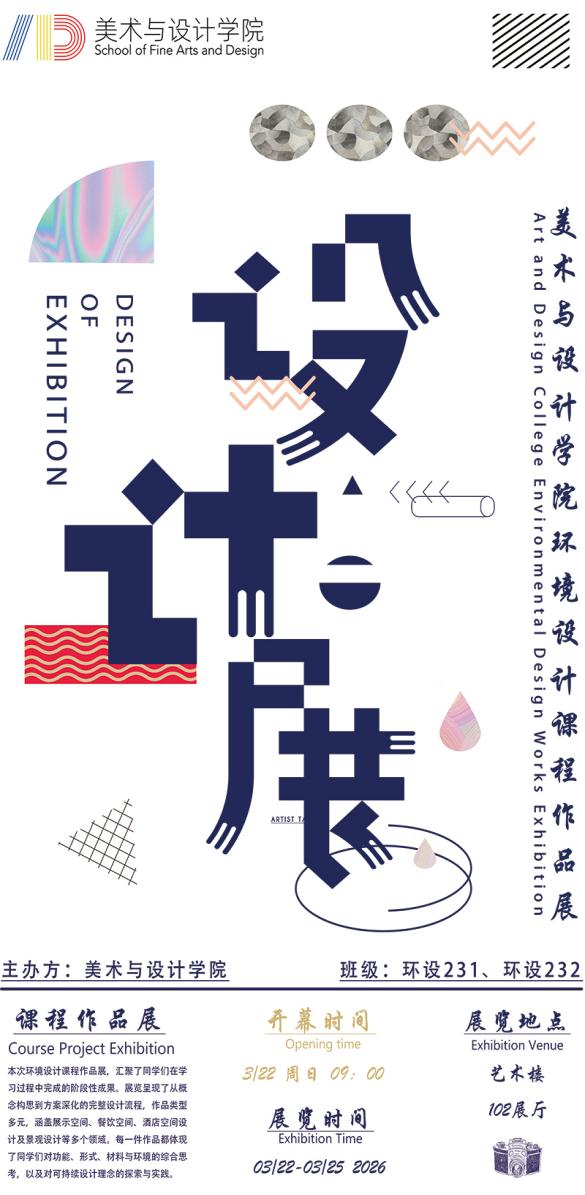 为夯实专业基础,展现专业课程教学成果,3月22日-25日,我院2023级环境设计课程作品展在艺术楼102展厅顺利开展。本次展览汇集了环设231、环设232班同学们的家居、酒店、餐饮及景观设计等优秀课程作业,为师生搭建了交流学习、展示创意的平台。
