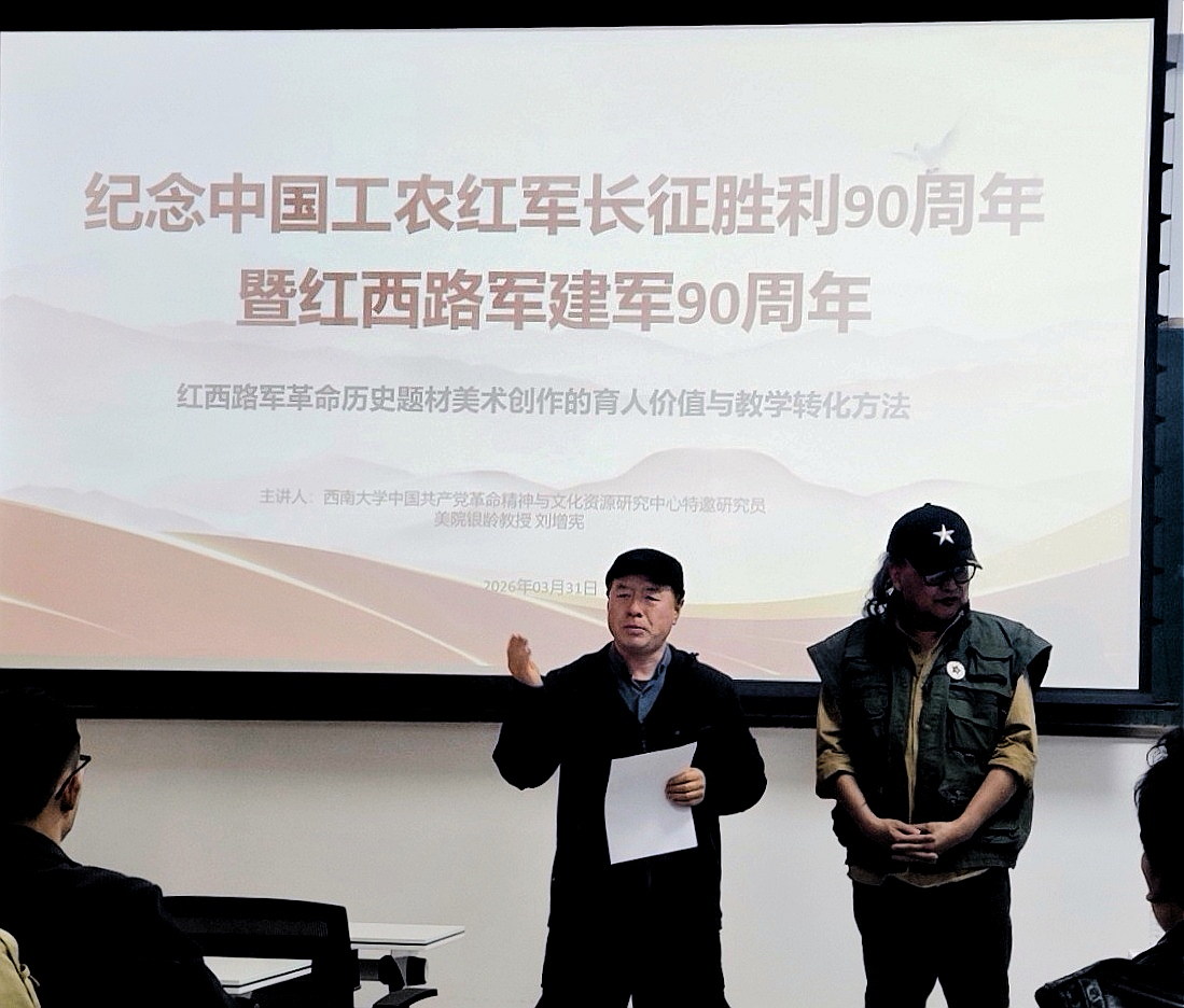 3月底,美术与设计学院银龄教授刘增宪代表学院参加由河西学院美术学院主办的课程思政建设教学研讨会。应邀出席会议的还有西南大学美术学院、山东师范大学等有关人员。各院校就依托红色资源,开展沉浸式教学实践活动,让红色基因融入艺术育人全过程进行互相交流。